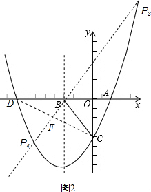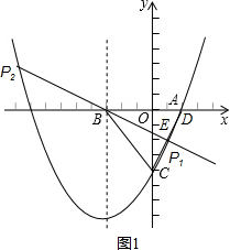 ①当D为(2,0)时,如图1,连接CD,过B作直线BE平分∠DBC交CD于E,交抛物线于P1,P2,![]()