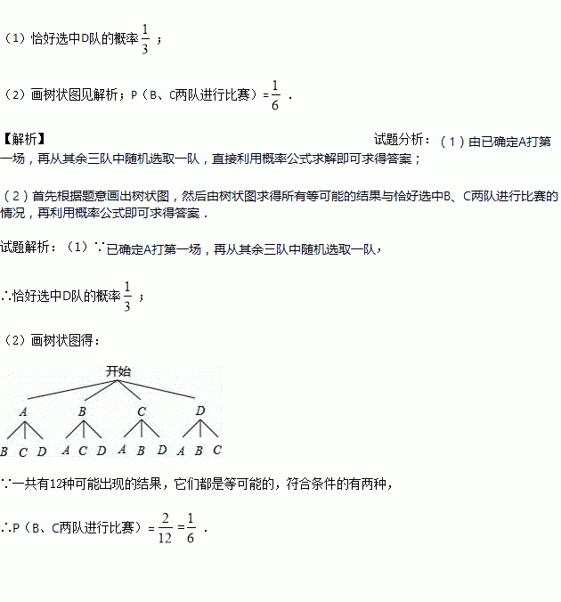 (1)若已确定A打第一场,再从其余三队中随机选取一队,求恰好选中D队的概率.