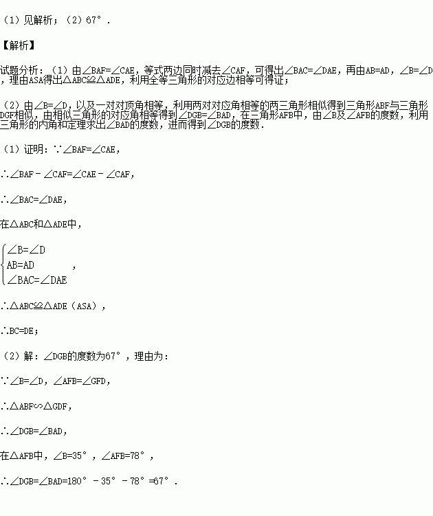(2012•西城区二模)如图,点F,G分别在△ADE的AD,DE边上,C,B依次为GF延长线上两点,AB=AD,∠BAF=∠CAE,∠B=∠D.
