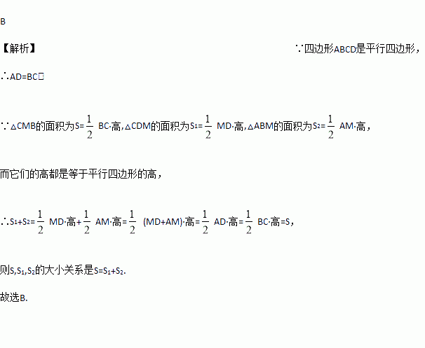 如图,M是平行四边形ABCD的边AD上任意一点,若△CMB的面积为S,△CDM的面积为S1,△ABM的面积为S2,则下列S, S1, S2的大小关系中正确的是( )