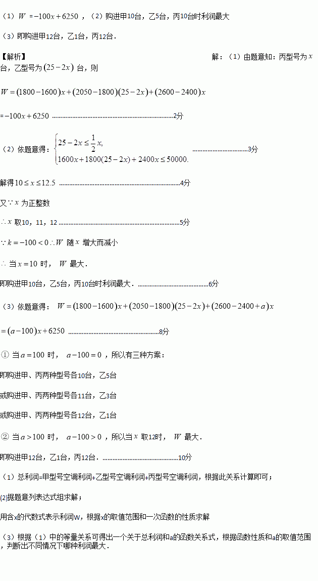 É̳¡¼Æ»®Í¶Èë×Ü×ʽð5ÍòÔª£¬Ëù¹º½øµÄ¼×¡¢±ûÐͺſյ÷ÊýÁ¿Ïàͬ£¬ÒÒÐͺÅÊýÁ¿²»³¬¹ý¼×ÐͺÅÊýÁ¿µÄÒ»°ë£®ÈôÉ蹺Âò¼×Ðͺſյ÷x̨£¬ËùÓÐÐͺſյ÷È«²¿ÊÛ³öºó»ñµÃµÄ×ÜÀûÈóΪWÔª£®