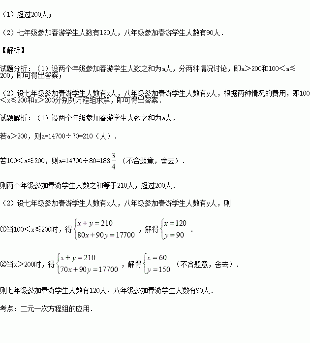 已知该校七年级参加春游学生人数多于100人,八年级参加春游学生人数少于100人.经核算,若两个年级分别组团共需花费17700元,若两个年级联合组团只需花费14700元.