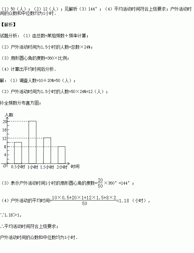 (4)本次调查中学生参加户外活动的平均时间是否符合要求?户外活动时间的众数和中位数是多少?