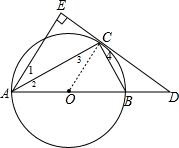 分析 (1)连结OC,如图,由AC平分∠DAE得∠1=∠2,加上∠2=∠3,则∠1=∠3,根据平行线的判定得到OC∥AE,由于AE⊥CD,于是可得OC⊥CD,然后根据切线得判断定理可判断DE是⊙O的切线;