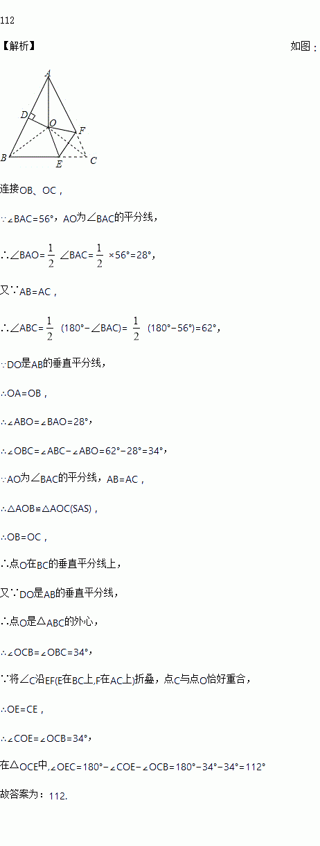 如图,△ABC中,AB=AC,∠BAC=56°,∠BAC的平分线与AB的垂直平分线交于点O,将∠C沿EF(E在BC上,F在AC上)折叠,点C与点O恰好重合,则∠OEC为__度.