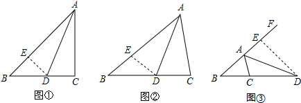 ②如图③,当∠C≠90°,AD为△ABC的外角平分线时,线段AB、AC、CD又有怎样的数量关系?请写出你的猜想并证明.