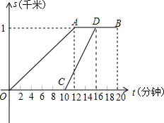 解答 解:(1)图中线段AB的实际意义是:小明出发12分钟后,沿着以他家为圆心,1千米为半径的圆弧形道路上匀速步行了8分钟;