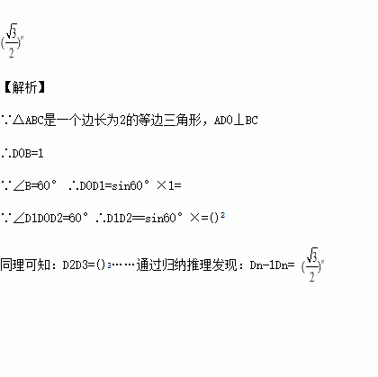 如图,△ABC是一个边长为2的等边三角形,AD0⊥BC,垂足为点D0.过点D0作D0D1⊥AB,垂足为点D1;再过点D1作D1D2⊥AD0,垂足为点D2;又过点D2作D2D3⊥AB,垂足为点D3;……;这样一直作下去,得到一组线段:D0D1,D1D2,D2D3,……,则线段Dn-1Dn的长为_ _(n为正整数).