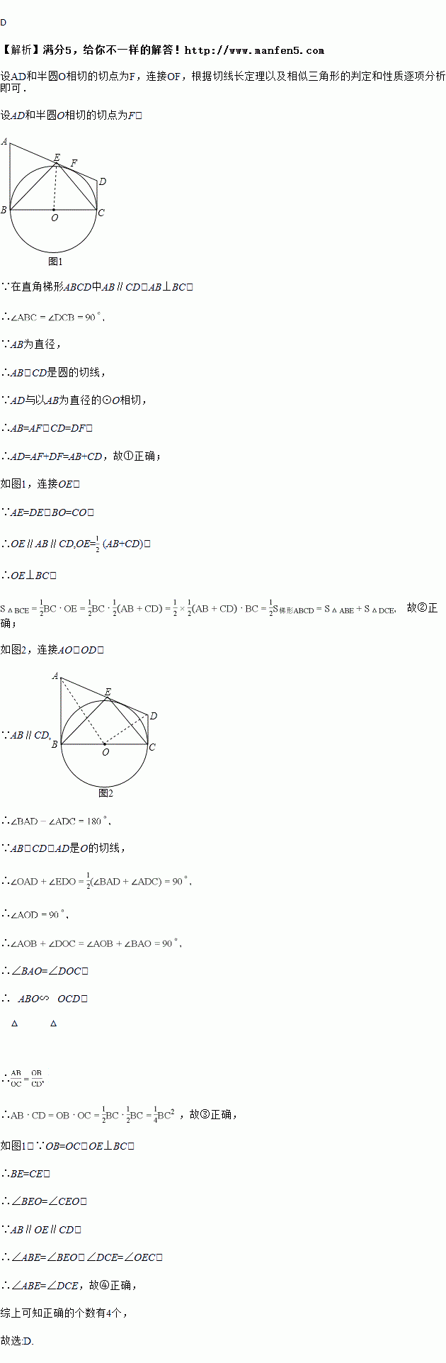 如图,在直角梯形ABCD中,AB∥CD,AB⊥BC,以BC为直径的⊙O与AD相切,点E为AD的中点,下列结论正确的个数是( )
