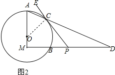 分析 (1)如图1,连接OC,根据等腰三角形的性质得到∠A=∠ACO,由MA⊥MB,得到∠M=90°,于是得到∠A+∠ADM=90°,根据对顶角相等得到∠ADM=∠PDC,等量代换得到∠A+∠PDC=90°,根据切线的性质得到∠OCD+∠PCD=90°,于是得到结论;