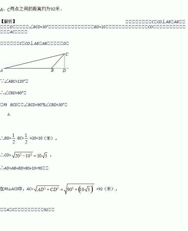 小红同学要测量A、C两地的距离,但A、C之间有一水池,不能直接测量,于是她在A、C同一水平面上选取了一点B,点B可直接到达A、C两地.她测量得到AB=80米,BC=20米,∠ABC=120°.请你帮助小红同学求出A、C两点之间的距离.(参考数据