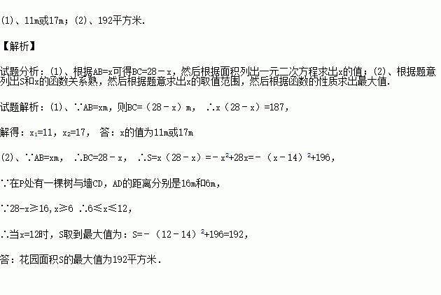 在美化校园的活动中,某兴趣小组想借助如图所示的直角墙角(两边足够长),用28m长的篱笆围成一个矩形花园ABCD(篱笆只围AB,BC两边),设AB=x(m).