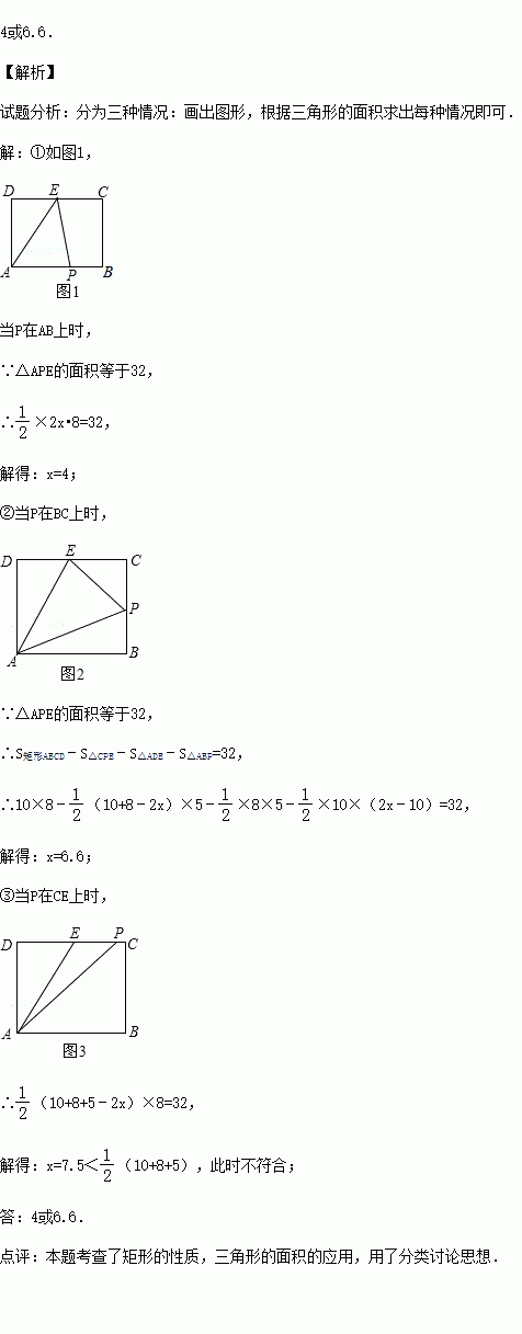 如图,长方形ABCD中,AB=10cm,BC=8cm,点E是CD的中点,动点P从A点出发,以每秒2cm的速度沿A→B→C→E 运动,最终到达点E.若点P运动的时间为x秒,那么当x为何值时,△APE的面积等于32cm2?(提醒:同学们,要分类讨论哦!)