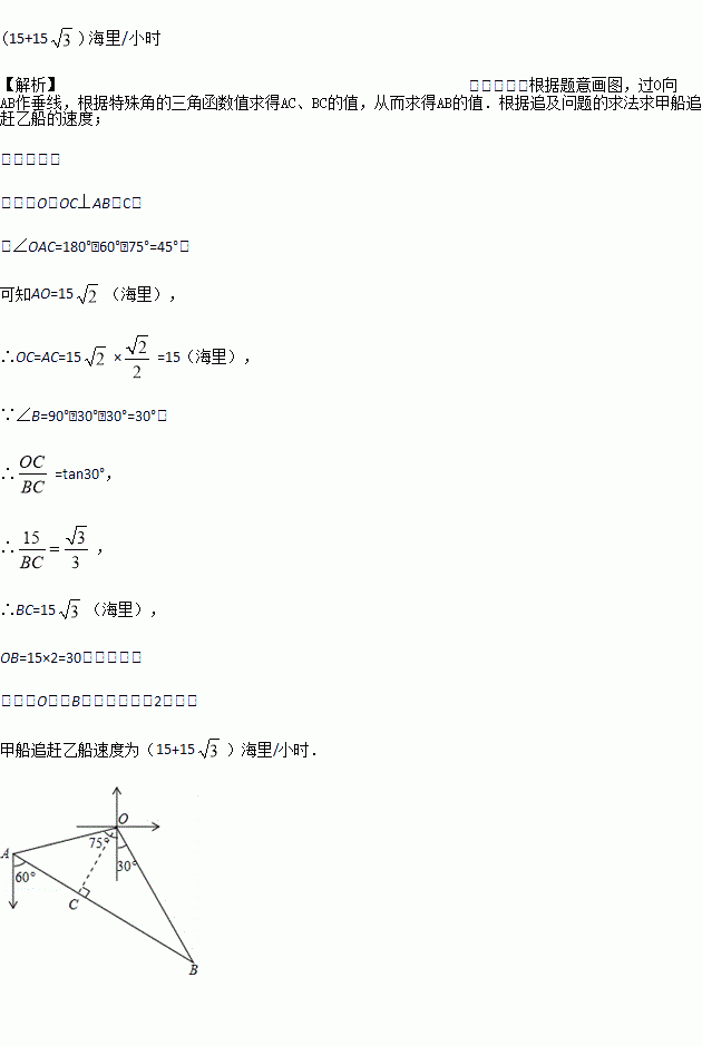 海里的速度航行,当航行1小时后,甲在A处发现自己的渔具掉在乙船上,于是迅速改变航向和速度,仍以匀速沿南偏东60°方向追赶乙船,正好在B处追上.甲船追赶乙船的速度为多少海里/小时?