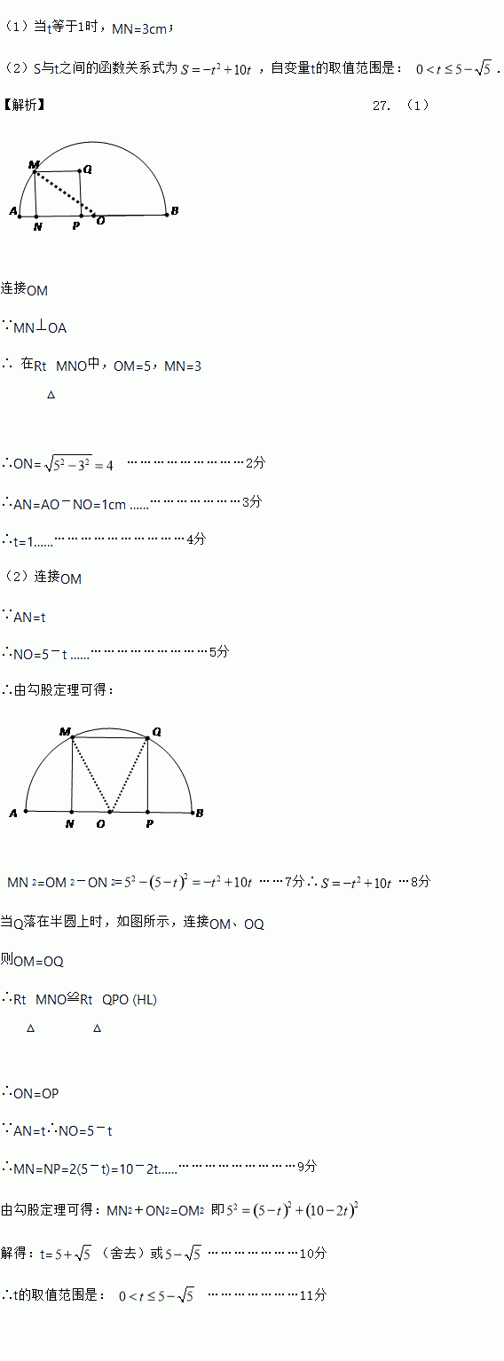 (2)如图2,以MN为边在半圆O内部作正方形MNPQ,使得点P落在AB上,点Q落在半圆内(或半圆上),设正方形MNPQ的面积为S.求S与t之间的函数关系式与自变量t的取值范围.