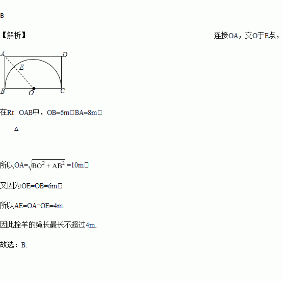 如图,王大伯家屋后有一块长12m、宽8m的长方形空地,他在以较长边BC为直径的半圆内种菜,他家养的一只羊平时拴在A处的一棵树上,为了不让羊吃到菜,拴羊的绳长最长不超过( )
