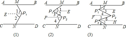 £¨3£©·Ö±ð¹ýµãP1¡¢P2£¬P3×÷P1E¡ÎAB£¬P2F¡ÎCD£¬P3H¡ÎCD£¬¸ù¾ÝƽÐÐÏßµÄÐÔÖʿɵáÏ1=¡Ï2£¬¡Ï3=¡Ï4£¬¡Ï5=¡Ï6£¬¡Ï7=¡Ï8£¬´Ó¶ø¿ÉµÃ¡Ï8+¡Ï4+¡Ï5+¡Ï1=¡Ï6+¡Ï7+¡Ï2+¡Ï3£¬½ø¶øµÃµ½¡ÏAMP1+¡ÏCNP3+¡ÏP1P2P3=¡ÏMP1P2+¡ÏP2P3N£®