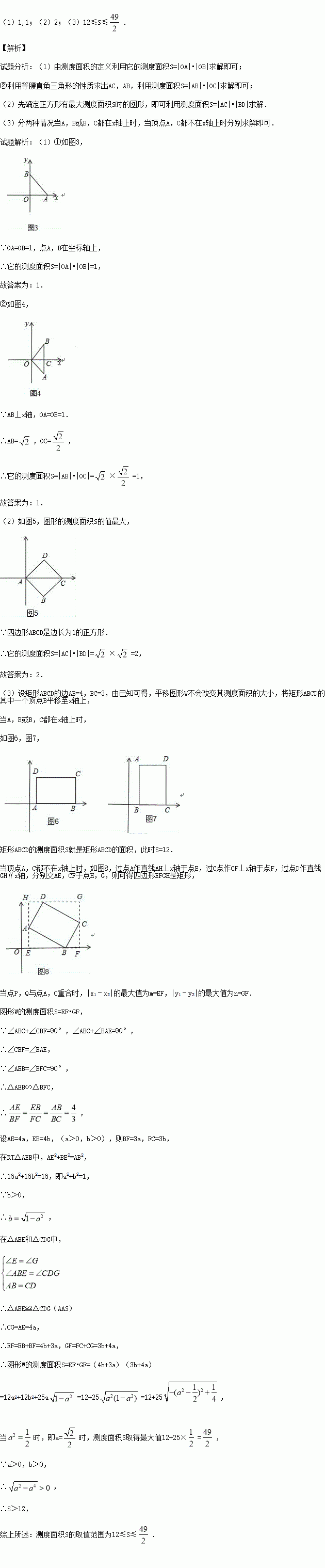(3)若图形W是一个边长分别为3和4的矩形ABCD,求它的测度面积S的取值范围.