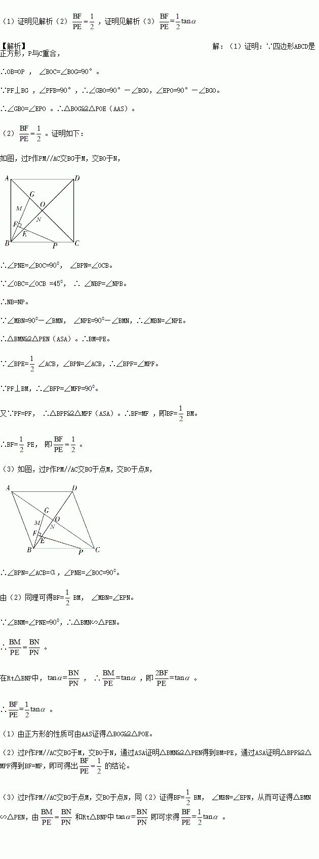 在正方形ABCD中,对角线AC,BD交于点O,点P在线段BC上(不含点B),∠BPE=