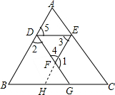 (2)延长EF交BC于点H,根据(1)中EF∥AB可知∠B+∠BGD=180°,∠3+∠BDE=180°,由∠3=∠B可知∠B+∠BDE=180°,所以DE∥BC,由平行线的性质可得出结论.