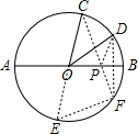 分析:作点D关于AB的对称点F,连接CF,与AB交于点P,此时点P的位置就是PC+PD取得最小值的位置.并且DP=FP,所以FP+PC=DP+CP,所以CF的值就是PC+PD的最小值,延长CO,与圆O交于点E,连接FE,这样就构造了一个含有特殊角的直角三角形,进而可求出CF.