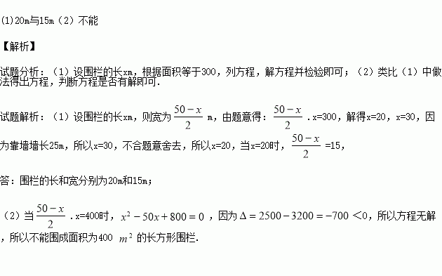 的长方形围栏?如果能,求出该长方形的长和宽,如果不能请说明理由。