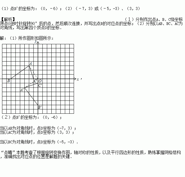 (1)将△ABC绕坐标原点O逆时针旋转90°,画出图形,直接写出点B的对应点的坐标;