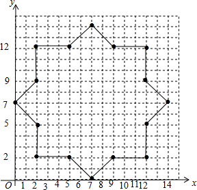 在下面的直角坐标系中描出下列各点,顺次用线段将下面各点连起来,并将最后一点与第一点连接起来,看看得到的是一个什么图形?(2,2),(5,2),(7,0),(9,2),(12,2),(12,5)(14,7),(12,9),(12,12),(9,12),(7,14),(5,12),(2,12),(2,9),(0,7),(2,5)