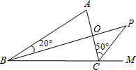 解答 解:如图:∵∠A+∠ABP+∠AOB=∠P+∠PCA+∠POC=180°,∠AOB=∠POC,∴∠A+∠ABP=∠P+∠PCA,∴∠A-∠P=∠PCA-∠ABP,∵∠ABP=20°,∠ACP=50°,∴∠A-∠P=30°,故答案为:30°.