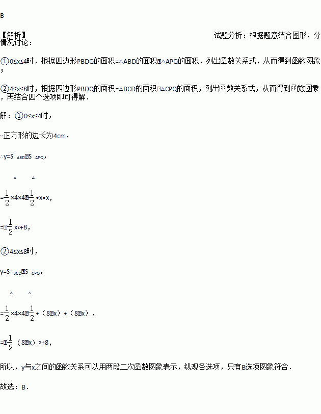 如图,正方形ABCD的边长为4cm,动点P、Q同时从点A出发,以1cm/s的速度分别沿A→B→C和A→D→C的路径向点C运动,设运动时间为x(单位:s),四边形PBDQ的面积为y(单位:cm2),则y与x(0≤x≤8)之间的函数关系可用图象表示为 ( )