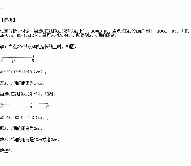 (2015秋•连城县期末)如果线段AB=6cm,BC=4cm,且线段A、B、C在同一直线上,那么A、C间的距离是( )