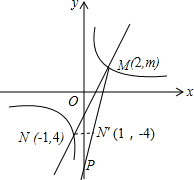 把N的坐标代入得k=-1×(-4)=4,反比例函数解析式为 y=$\frac{4}{x}$,![]()