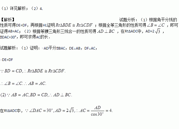 如图,在△ABC中.AD平分∠BAC,且BD=CD,DE⊥AB于点E,DF⊥AC于点F.