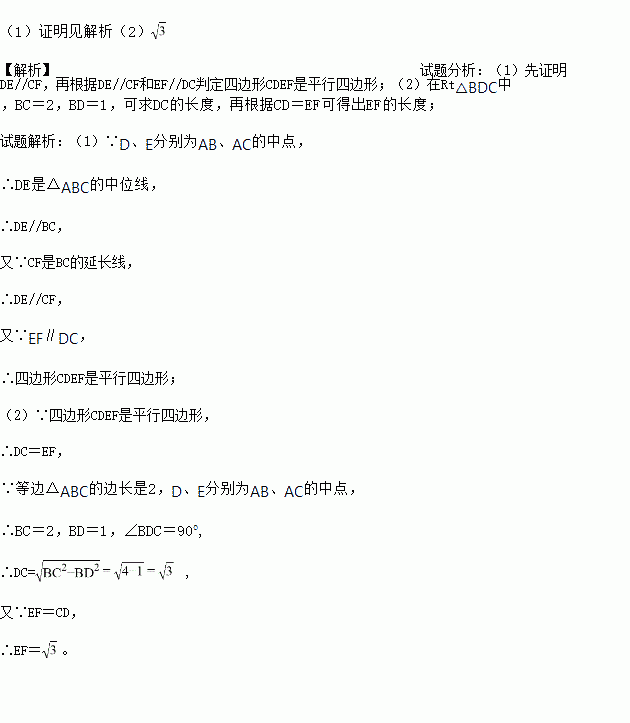 如图,等边△ABC的边长是2,D、E分别为AB、AC的中点,过E点作EF∥DC交BC的延长线于点F,连接CD.