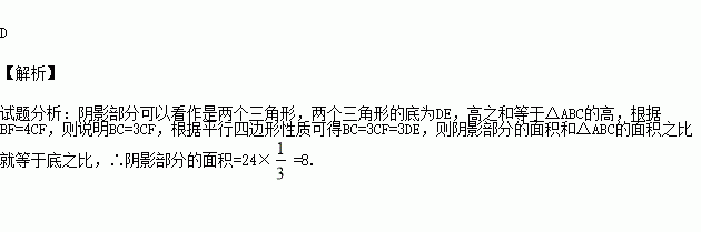 如图,已知△ABC的面积为24,点D在线段AC上,点F在线段BC的延长线上,且BF=4CF,四边形DCFE是平行四边形,则图中阴影部分的面积为( ).