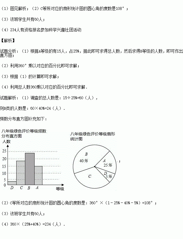 (4)如果科学素养成绩是B等及B等以上的学生才能报名参加科学兴趣社团活动,请你用该班学生的情况估计该校八年级360名学生中,有多少名学生有资格报名参加科学兴趣社团活动?