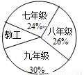 某校组织开展“迎新春长跑活动”,将报名的男运动员共分成4组,分别是:七年级组、八年级组、九年级组、教工组,各组人数所占比例如图所示,已知九年级组有60人,则教工组人数是_________。