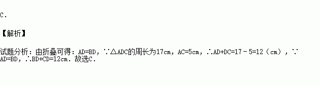 如图,将△ABC沿直线DE折叠后,使得点B与点A重合.已知AC=5cm,△ADC的周长为17cm,则BC的长为( )