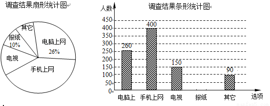 (2)通过“电视”了解新闻的人数占被调查人数的百分比为 ;扇形统计图中, “手机上网”所对应的圆心角的度数是 ;