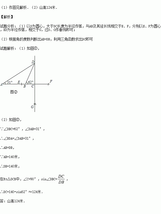 为测山高,在点A处测得山顶D的仰角为31°,从点A向山方向前进140米到达点B,在B处测得山顶D的仰角为62°(如图).