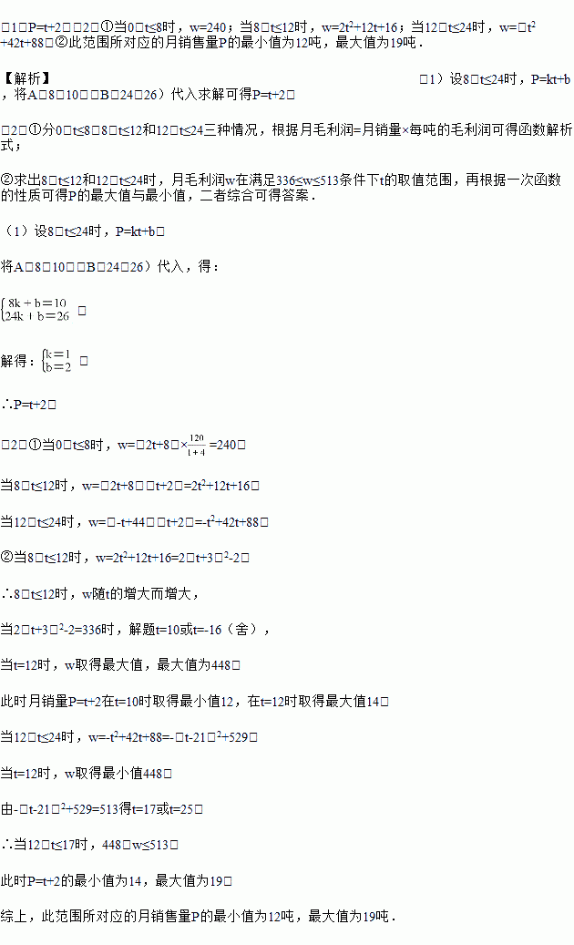 ②该药厂销售部门分析认为,336≤w≤513是最有利于该原料药可持续生产和销售的月毛利润范围,求此范围所对应的月销售量P的最小值和最大值.