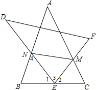分析 根据已知条件得到∠B=∠3=∠C=∠F,由三角形的内角和和平角的定义得到∠2=∠4,推出△BEN∽△CME,得到$\frac{CM}{BE}=\frac{ME}{EN}$,等量代换得到$\frac{CM}{CE}=\frac{EM}{EN}$,于是推出△CME∽△MEN,根据相似三角形的性质即可得到结论.