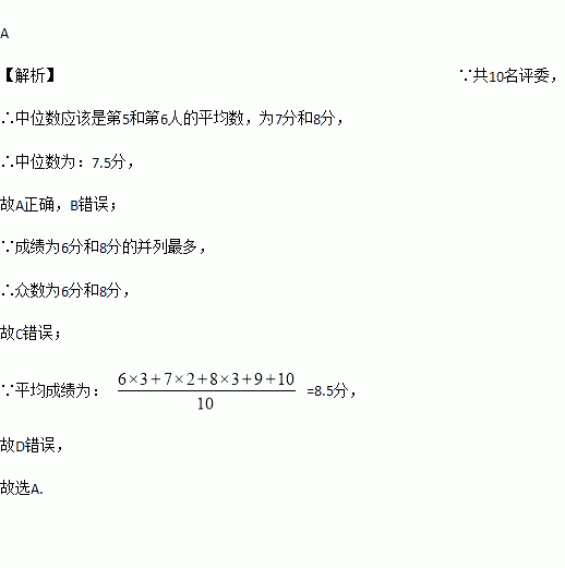 A. 中位数是7.5分 B. 中位数是8分 C. 众数是8分 D. 平均数是8分