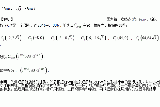 ,将△OBC绕原点O逆时针旋转60°再将其各边扩大为原来的2倍,使OB1=OC,得到△OB1C1,将△OB1C1绕原点O逆时针旋转60°再将其各边扩大为原来的2倍,使OB2=OC,得到△OB2C2,…,如此继续下去,得到△OB2016C2016,则点C2016的坐标为__.