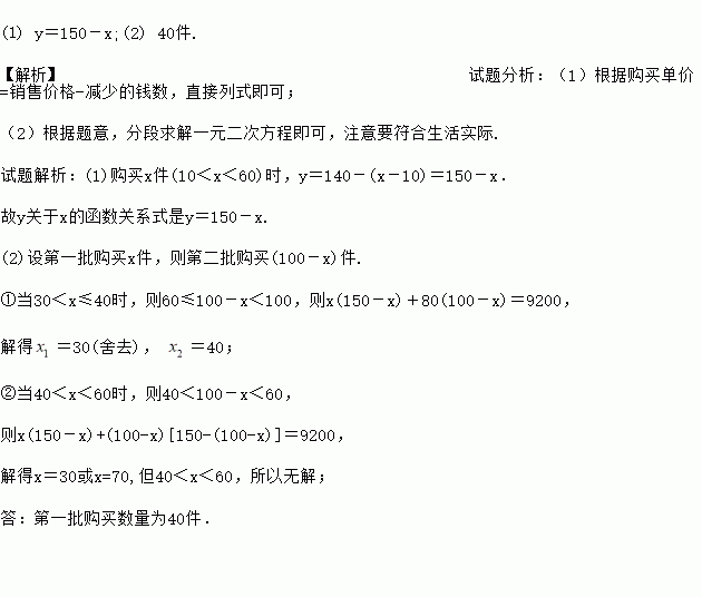 (1)如果购买x件(10<x<60),每件的单价为y元,请写出y关于x的函数关系式;