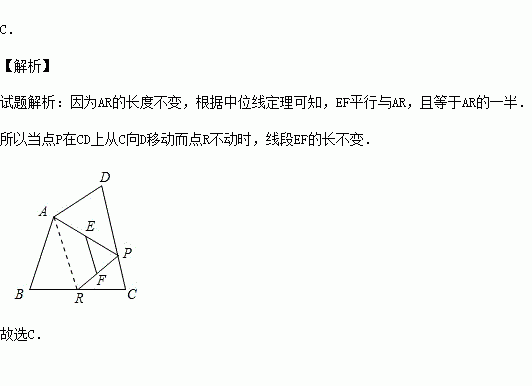 如图,已知四边形ABCD中,R、P分别是BC、CD上的点,E、F分别是AP、RP的中点,当点P在CD上从C向D移动而点R不动时,那么下列结论成立的是 ( )