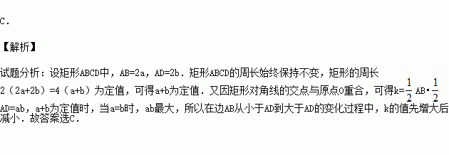 如图,矩形ABCD的顶点A在第一象限,AB∥x轴,AD∥y轴,且对角线的交点与原点O重合.在边AB从小于AD到大于AD的变化过程中,若矩形ABCD的周长始终保持不变,则经过动点A的反比例函数y=