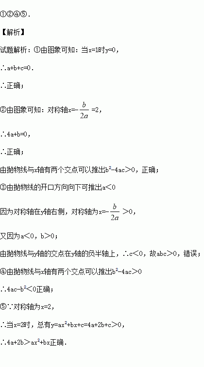 二次函数y=ax2+bx+c的图象如图所示,以下结论:①a+b+c=0;②4a+b=0;③abc<0;④4ac-b2<0;⑤当x=2时,总有4a+2b>ax2+bx其中正确的有 (填写正确结论的序号).