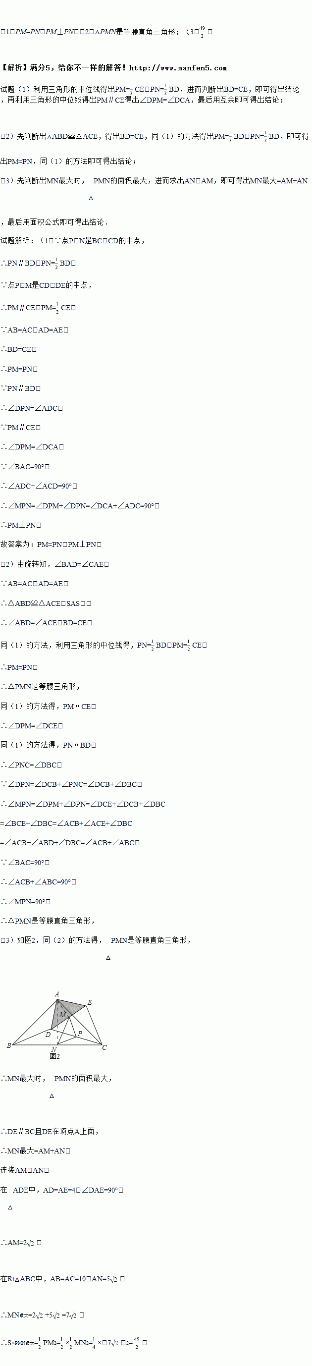 如图1,在Rt△ABC中,∠A=90°,AB=AC,点D,E分别在边AB,AC上,AD=AE,连接DC,点M,P,N分别为DE,DC,BC的中点.