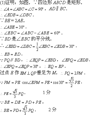 ÔÚ¾ØÐÎABCDÖУ¬µãEÊÇAD±ßÉÏÒ»µã£¬Á¬½áBE£¬ÇÒBE£½2AE£¬BDÊÇ¡ÏEBCµÄƽ·ÖÏߣ®µãP´ÓµãE³ö·¢ÑØÉäÏßEDÔ˶¯£¬¹ýµãP×÷PQ¡ÎBD½»Ö±ÏßBEÓÚµãQ£®